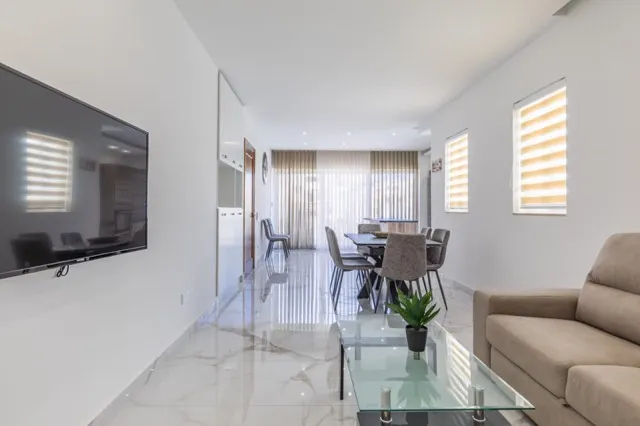MELLIEHA – En ljus, modern och välpresenterad tvåsovrums takvåning som erbjuder förfinad boendestandard i ett lugnt men centralt område i Mellieha uthyres nu. Denna vackert genomförda fastighet består av ett öppet kök/vardagsrum/matsal, två sovrum (huvudsovrum med eget badrum), ett huvudbadrum samt en stor terrass med solstolsområde och pool. Perfekt för hyresgäster som söker ett fantastiskt hem med exceptionellt utomhusutrymme och högklassiga material, idealiskt för avslappnat boende och underhållning.