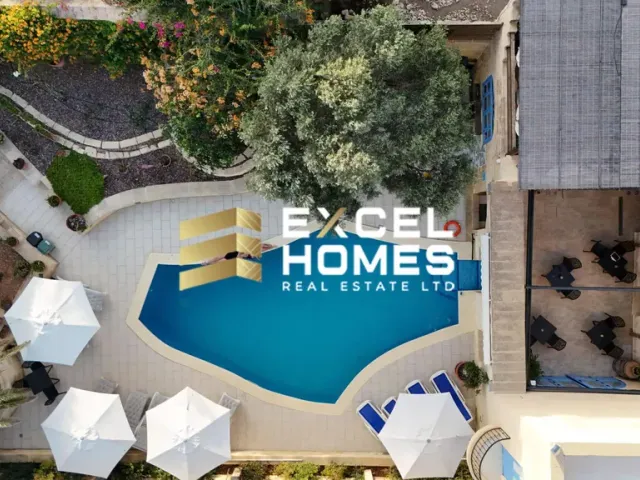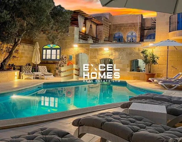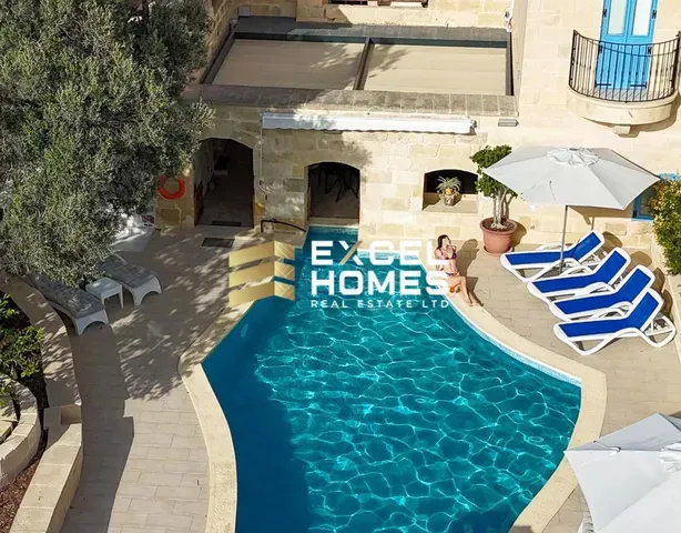 An outstanding opportunity to acquire a meticulously restored and fully furnished House of Character, finished to an exceptional standard throughout. This impressive residence offers five spacious bedrooms and seven bathrooms, providing generous accommodation ideal for both family living and entertaining. The property is being sold fully furnished, with carefully selected pieces that complement its traditional architectural features. Externally, the home enjoys a private swimming pool, Jacuzzi, landscaped garden, and multiple terraces designed for seamless indoor-outdoor living. The property is pet friendly and offers ample space for relaxation and entertaining. Additional features include: Air conditioning throughout Washing machine and tumble dryer Dishwasher Photovoltaic panels Solar water heater Two private wells Combining authentic Gozitan character with modern comfort and energy efficiency, this residence represents a rare and distinguished offering in todays market. For further information or to arrange a private viewing, contact Excel Homes.