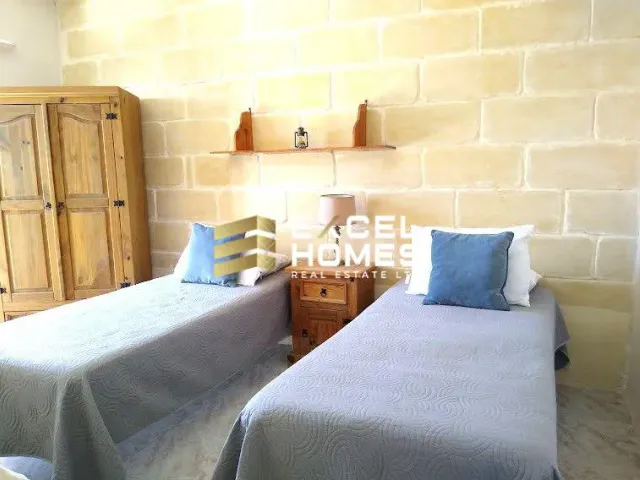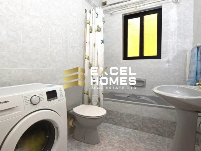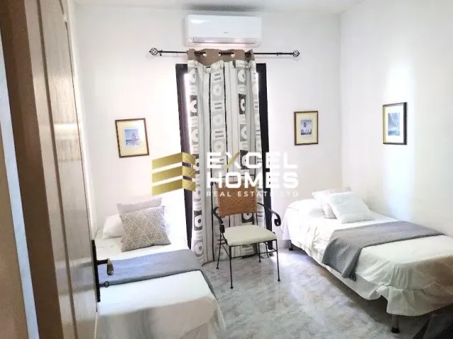 Elevated on the almost first floor, this spacious Maisonette offers over 120 sqm of comfortable living space, perfect for a family of four. Step onto the front balcony and unwind amidst the tranquil surroundings. Inside, discover an inviting living area complete with a plush sofa and entertainment setup. The fully equipped kitchen, conveniently connected to a central sunny yard, makes laundry days a breeze. The accommodation boasts a master bedroom with an En-suite shower and A/C, a sunny single bedroom with blackout curtains, and a charming third bedroom in typical Maltese style, complete with two beds and a blackout curtain, all with access to the rear sunny terrace adorned with lush greenery.